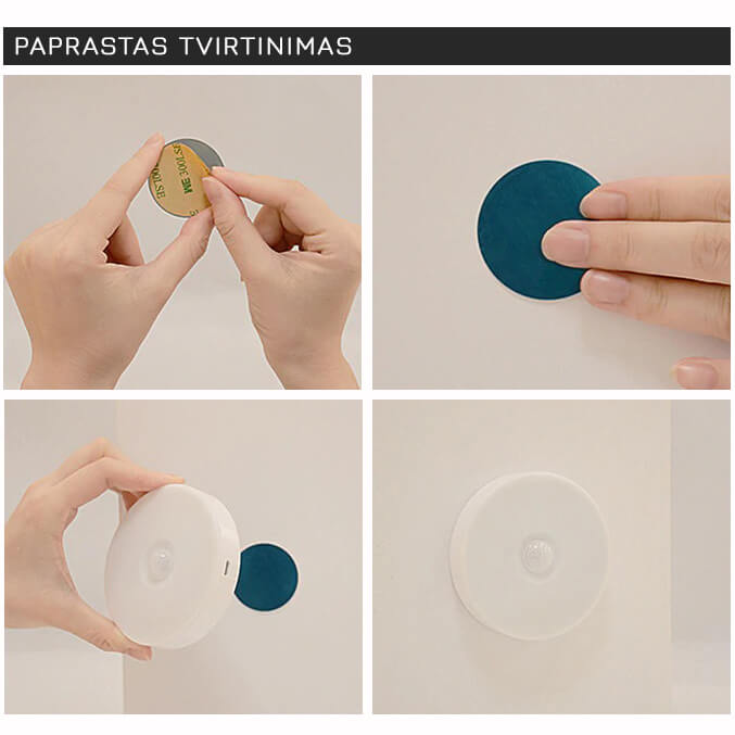 Šviestuvus sumontuoti labai paprasta ir tam nereikia jokių įrankių. Pakuotėje kartu su šviestuvais yra magnetukai, kurių viena pusė prilimpa prie šviestuvo korpuso, o kita magnetuko pusė, kaip lipdukas priklijuojama prie sienos. Lipdukai tvirti, tačiau juos nuimant sienos paviršius nepažeidžiamas. Nuimtus lipdukus galima naudoti pakartotinai, o šviestuvą perkeltį į kitą vietą.